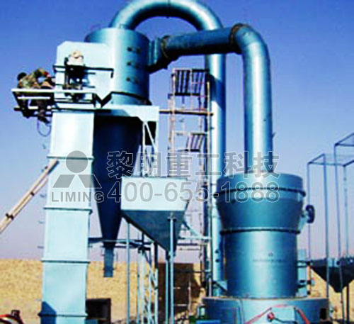 大塊狀物料經(jīng)顎式破碎機(jī)破碎到所需要粒度后,由提升機(jī)將物料送至儲(chǔ)料斗,再經(jīng)振動(dòng)給料機(jī)均勻定量連續(xù)地送入主機(jī)磨室內(nèi)進(jìn)行研磨。粉磨后的粉子被風(fēng)機(jī)氣流帶走,經(jīng)分析機(jī)分級(jí),符合細(xì)度的粉子隨氣流經(jīng)管道進(jìn)入大旋風(fēng)收集器內(nèi),進(jìn)行分離收集,再經(jīng)粉管排出成品粉子。
