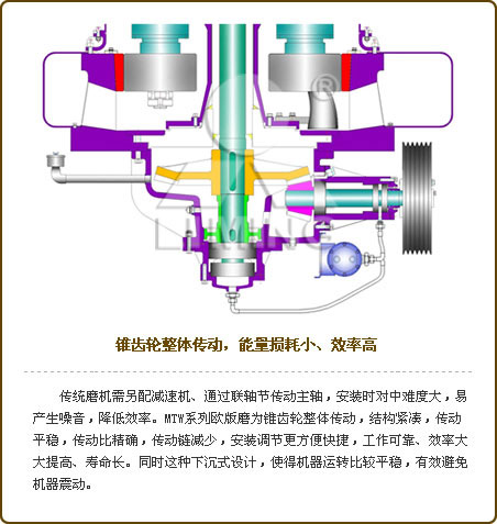 MTW系列歐版磨粉機(jī)工作原理整機(jī)為立式結(jié)構(gòu),占地面積小,成套性強(qiáng),而且主機(jī)傳動(dòng)裝置采用密閉齒輪箱,傳動(dòng)平穩(wěn)。磨機(jī)的重要部件均采用品質(zhì)良好鋼材制造,因此整機(jī)耐用可靠。磨粉機(jī)電器系統(tǒng)采用集中控制,選型標(biāo)準(zhǔn)合理,自動(dòng)化程度高,振動(dòng)給料機(jī)體積小重量輕,易于調(diào)節(jié)并省電。