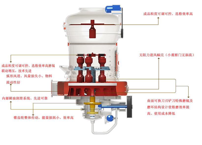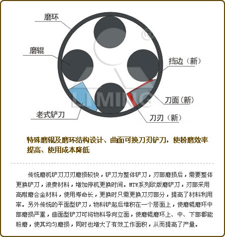 曲面可換刀刃鏟刀,特殊磨輥及磨環(huán)結(jié)構(gòu)設(shè)計(jì)使粉磨效率提高、使用成本降低