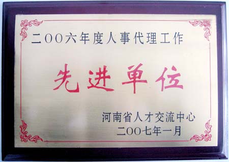 2007年1月28日,河南省人事代理先進單位表彰大會在河南省“戰(zhàn)友大酒店”隆重召開,根據《關于表彰2006年度人事代理工作先進單位和先進工作才的決定》(豫人才發(fā)〔2007〕3號),我公司繼2004年度、2005年度兩次被評為“河南省人事代理先進單位”之后,再獲此殊榮。公司人力資源部喬經理等同志被表彰為先進工作者。