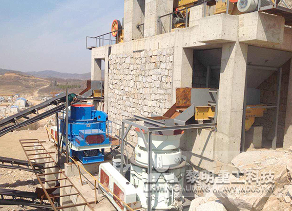 大塊物料經過GZD1500×6000振動給料機被均勻的送進HJW145高能顎破中進行粗碎;粗碎后的物料經過兩臺GZD960×3800振動給料機進入兩臺HJ98高能顎破中進行中碎;中碎后的物料經過兩臺GZD960×3800振動給料機均勻的喂入兩臺HPT300多缸液壓圓錐破進行細碎;細碎后的物料經過三臺YZS2160振動篩分級后,10-25mm成為骨料產品,25mm以上的返回HPT300多缸液壓圓錐破循環(huán)破碎,0-10mm的物料進入VSI9526沖擊破進行整形,產出0-5mm的成品機制砂。