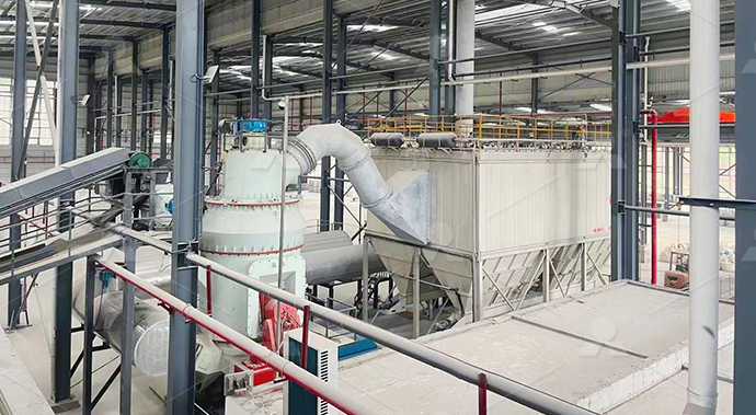 第二階段:磨粉破碎后的重晶石小塊物料經(jīng)提升機送至料倉,再經(jīng)振動給料機將其均勻定量的送入磨機研磨室內(nèi)進(jìn)行研磨。