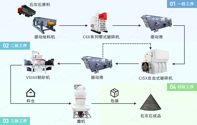 石灰石或石灰?guī)r資源豐富,原礦品位一般能滿足各工業(yè)部門的要求。因此,一般只需要進行簡單的洗礦,不需要采用復雜的選礦工藝進行提純。石灰石的加工主要是粉碎、分級以及生產(chǎn)生石灰、熟石灰、沉淀碳酸鈣、超微細(納米)碳酸鈣、二氧化碳等。石灰石一般采用干式粉碎工藝,對于冶金、道路用石灰石,將礦石破碎篩分后即可。對于細粉產(chǎn)品的生產(chǎn),礦石經(jīng)顎式破碎機、反擊式破碎機或圓錐式破碎機等破碎后直接用雷蒙磨粉磨,產(chǎn)品細度100-325目,具體加工流程如下: