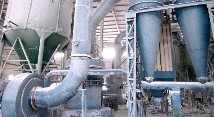 第二階段:磨粉破碎后的滑石小塊物料經(jīng)提升機(jī)送至料倉(cāng),再經(jīng)振動(dòng)給料機(jī)將其均勻定量的送入磨機(jī)研磨室內(nèi)進(jìn)行研磨。