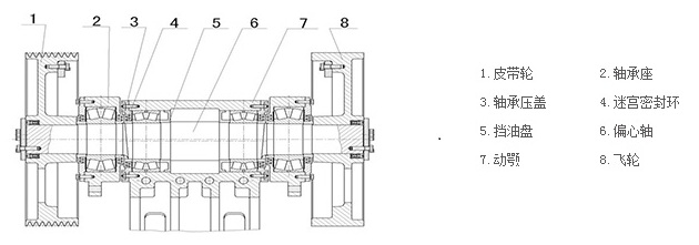 檢查飛、槽輪配重中心位置是否正確,槽輪配重中心應(yīng)通過主軸中心孔與主軸偏心孔相對應(yīng)180度成為一條直線。