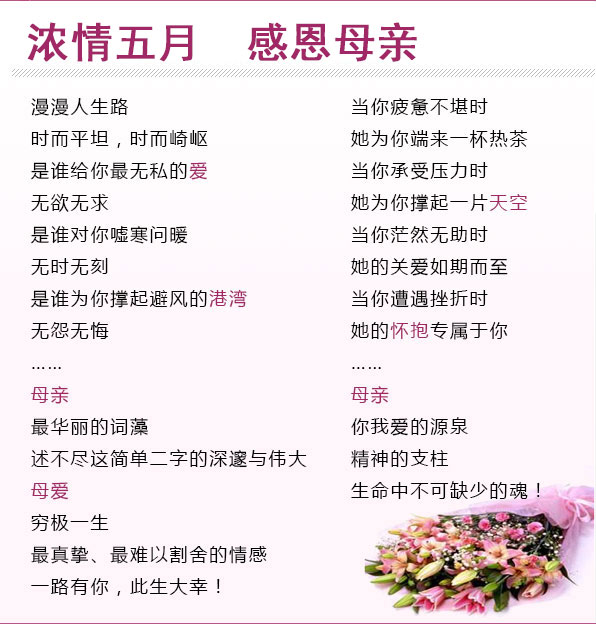 在這特別的日子送上我特別的祝福:母親節(jié)快樂!媽媽,我永遠愛你!