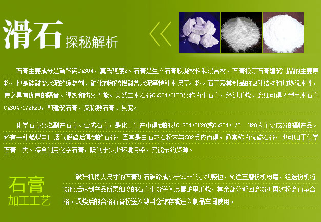 石膏主要成分是硫酸鈣CaSO4,莫氏硬度2。石膏是生產(chǎn)石膏膠凝材料和混合材、石膏板等石膏建筑制品的主要原料,也是硅酸鹽水泥的緩凝劑、礦化劑和硫鋁酸鹽水泥等特種水泥原材料。石膏及其制品的微孔結(jié)構(gòu)和加熱脫水性,使之具有優(yōu)良的隔音、隔熱和防火性能。天然二水石膏CaSO4.2H2O又稱為生石膏,經(jīng)過煅燒、磨細(xì)可得β型半水石膏CaSO4.1/2H2O,即建筑石膏,又稱熟石膏、灰泥。