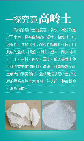 質(zhì)純的高嶺土白度高、質(zhì)軟、易分散懸浮于水中,具有良好的可塑性、粘結(jié)性、電絕緣性、抗酸溶性、耐火性等理化性質(zhì),因此成為造紙、陶瓷、橡膠、塑料、耐火材料、化工、涂料、醫(yī)藥、國防、航天等數(shù)十種行業(yè)的礦物原料。造紙工業(yè)是精制高嶺土大的消費部門。造紙用煅燒高嶺土以品質(zhì)良好的煤系高嶺土為原料,經(jīng)選礦、超細(xì)粉磨、煅燒而成。