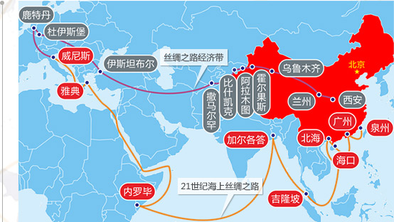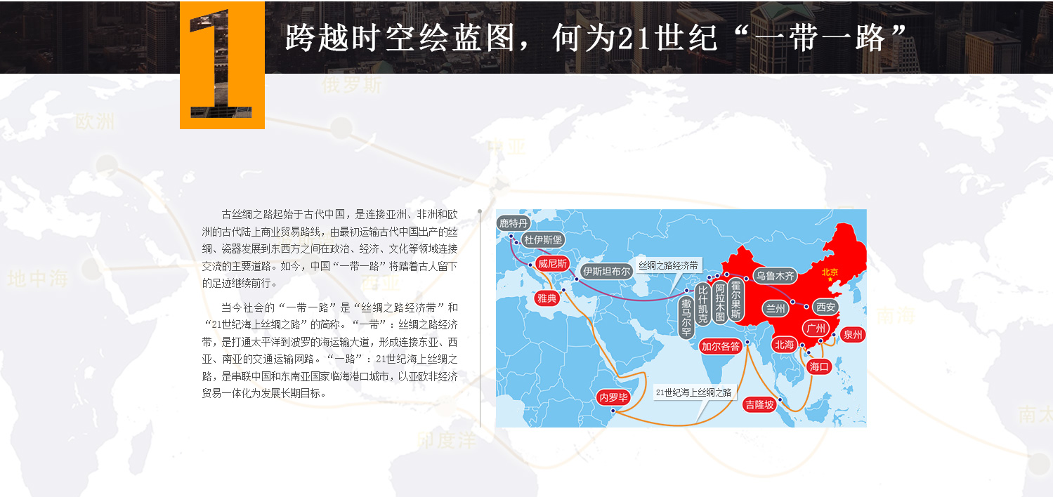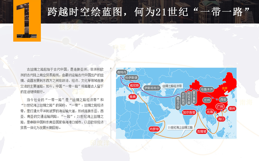 當今社會的“一帶一路倡議”是“絲綢之路經(jīng)濟帶”和 “21世紀海上絲綢之路”的簡稱。“一帶”:絲綢之路經(jīng)濟帶,是打通太平洋到波羅的海運輸大道,形成連接?xùn)|亞、 西亞、南亞的交通運輸網(wǎng)路。“一路”:21世紀海上絲綢之路,是串聯(lián)中國和東南亞國家臨海港口城市,以亞歐非經(jīng) 濟貿(mào)易一體化為發(fā)展長期目標。