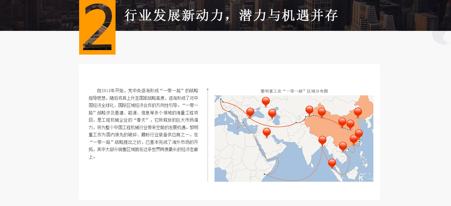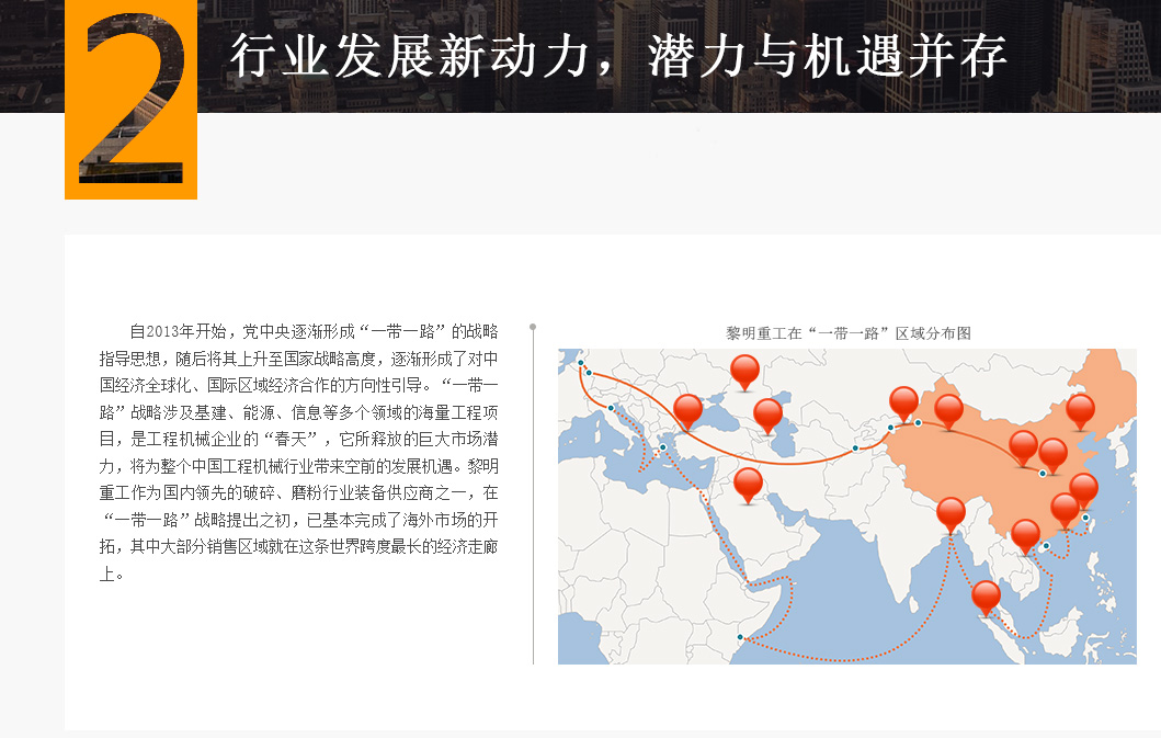 自2013年開始,黨中央逐漸形成“一帶一路倡議”的戰(zhàn)略指導(dǎo)思想,隨后將其上升至國家戰(zhàn)略高度,逐漸形成了對中國經(jīng)濟全球化、國際區(qū)域經(jīng)濟合作的方向性引導(dǎo)。“一帶一路倡議”戰(zhàn)略涉及基建、能源、信息等多個領(lǐng)域的海量工程項目,是工程機械企業(yè)的“春天”,它所釋放的巨大市場潛力,將為整個中國工程機械行業(yè)帶來發(fā)展機遇。黎明重工作為國內(nèi)知名的破碎、磨粉行業(yè)裝備供應(yīng)商之一,在“一帶一路倡議”戰(zhàn)略提出之初,已基本完成了海外市場的開拓,其中大部分銷售區(qū)域就在這條世界跨度最長的經(jīng)濟走廊上。