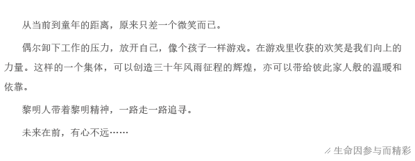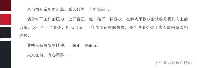 對運(yùn)動會的憧憬,似乎斷在了畢業(yè)照的咔擦聲里。初入職場的你,每天在手忙腳亂里一點(diǎn)點(diǎn)褪去學(xué)生氣. 三年后的你, 工作節(jié)奏終于從容,激情卻隱在時光里;在職場馳騁過十年,白駒過隙里你嘆著氣恐懼著中年危機(jī)。是你嗎?不該是你!因?yàn)樵谶@里,青春,不畢業(yè)! 無數(shù)個 精彩瞬間 值得鐫刻 看起來些許幼稚的游戲卻讓一群人脫下工裝,如孩童般歡呼跳躍。和有趣的人一起做有趣的事,快樂從未這樣簡單過。 我的榮譽(yù)是 身旁 有你 是相遇的那份慶幸,讓彼此都活得盡興。 是你們,陪著我一起鬧,一起笑,一起忘掉不快,享受現(xiàn)在。