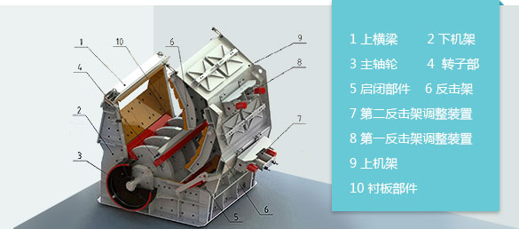 由機(jī)架部分、轉(zhuǎn)子部分、反擊架、翻蓋裝置和傳動(dòng)部分組成。工作時(shí),電機(jī)高速旋轉(zhuǎn)帶動(dòng)轉(zhuǎn)子做高速運(yùn)動(dòng)。當(dāng)物料由入料口進(jìn)入機(jī)器時(shí),受到轉(zhuǎn)子上的板錘高速撞擊而被破碎,然后被拋到反擊襯板上再次破碎,之后又從反擊襯板上彈回到板錘作用區(qū)重新破碎。在此過(guò)程中,物料之間也相互撞擊,達(dá)到破碎的效果。此過(guò)程重復(fù)進(jìn)行,直到物料被破碎至所需粒度,由出料口排出。