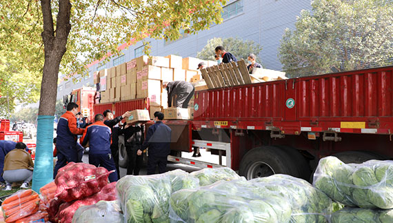 封控之下,臨港基地的生活物資和生產(chǎn)物資,都十分短缺。4 月初,黎明鄭州總部及時辦理好保供相關(guān)通行證,將新鮮時蔬、米面糧油等生活必需品分揀、裝箱、裝車,馳援浦東。